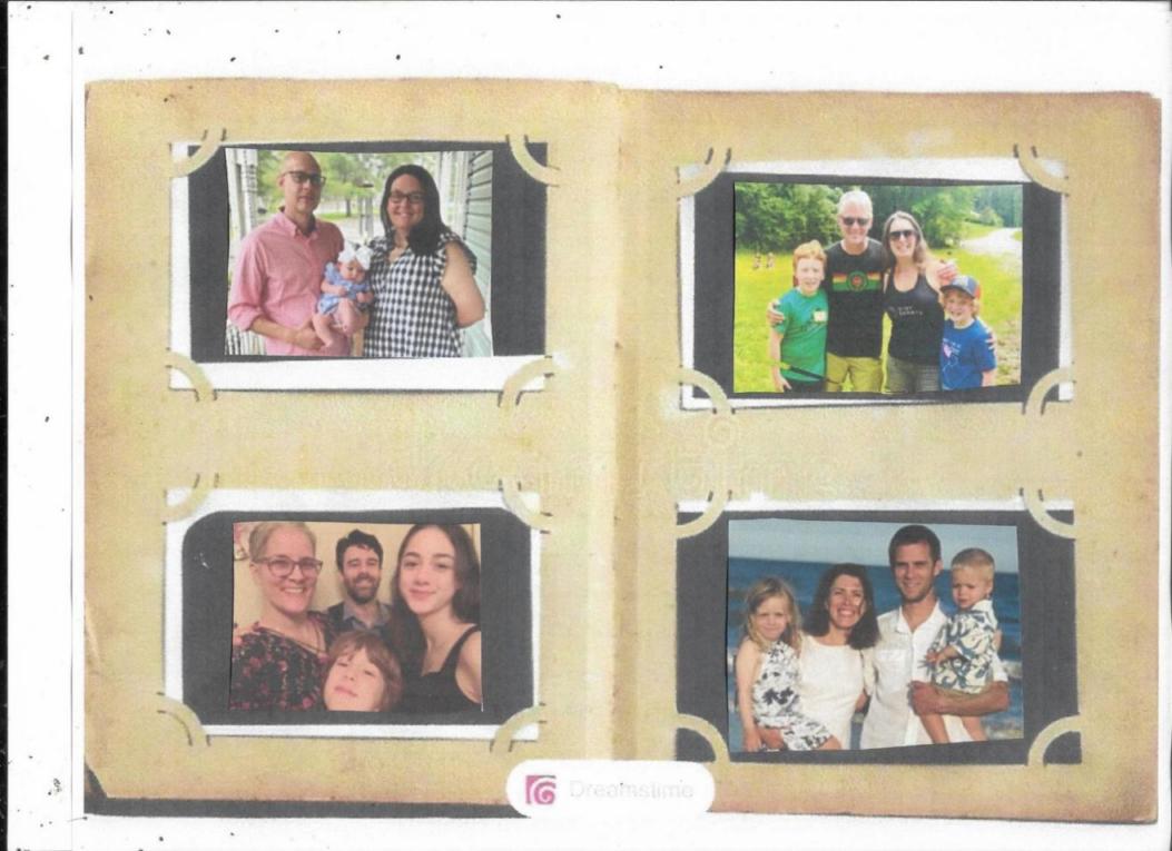 In the scrapbook are (top left photo) my oldest son Michael, daughter-in-law Lauren, and their 3-month-old baby daughter, Clara; (top right photo) my daughter Katie with her husband Matt and their sons, Van and Woody; (bottom left photo) my son Brian with his wife, Mary Beth, and their daughter Evie and son Oliver; and (bottom right photo) my youngest son Kevin with his wife Jennifer and their daughter Ellis and son Henry.