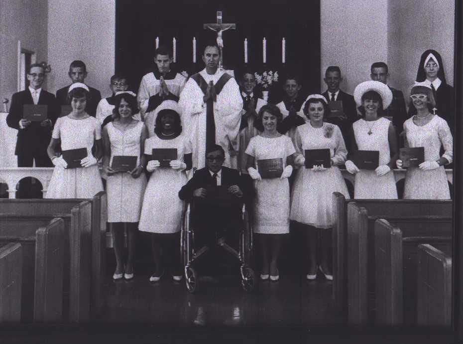 [Back Row] ____?____, Gene Luscinski, ____?____, Joel Luscinski, the Rev. Phillip Thoni, Bobby Allen, ____?____, ____?____,Bruce Hutchinson, Sister Catherine Mary